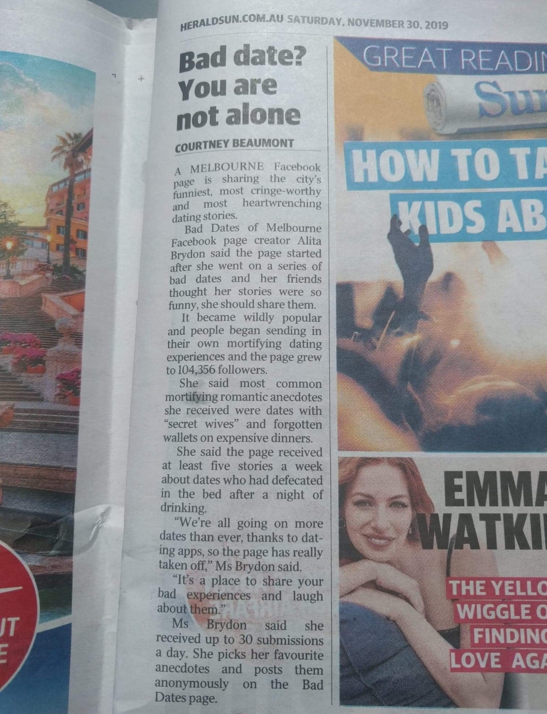 This week I’m on the brilliant news.com.au podcast, Ghosted, where I talk about my “hilarious, depressing and somehow reassuring” social media creation, ‘Bad Dates of Melbourne’.